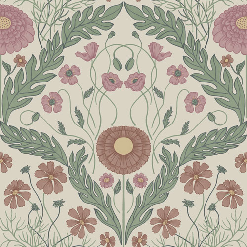 Mönsterbeskrivning: Vit tapet med gröna blad och rosa/röda blommor