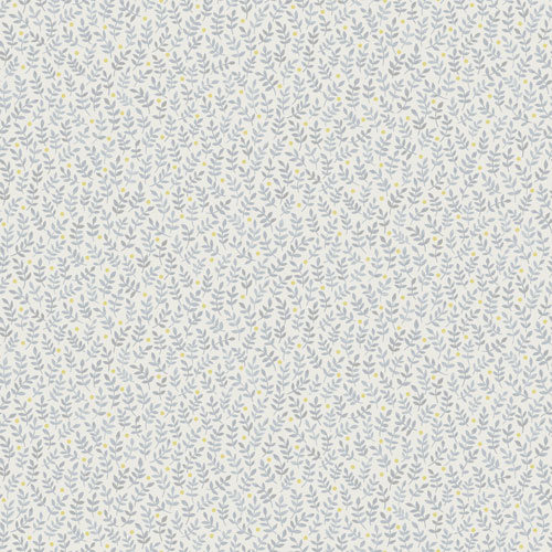 Mönsterbeskrivning: Vit tapet med blått litet bladmönster och gula prickar