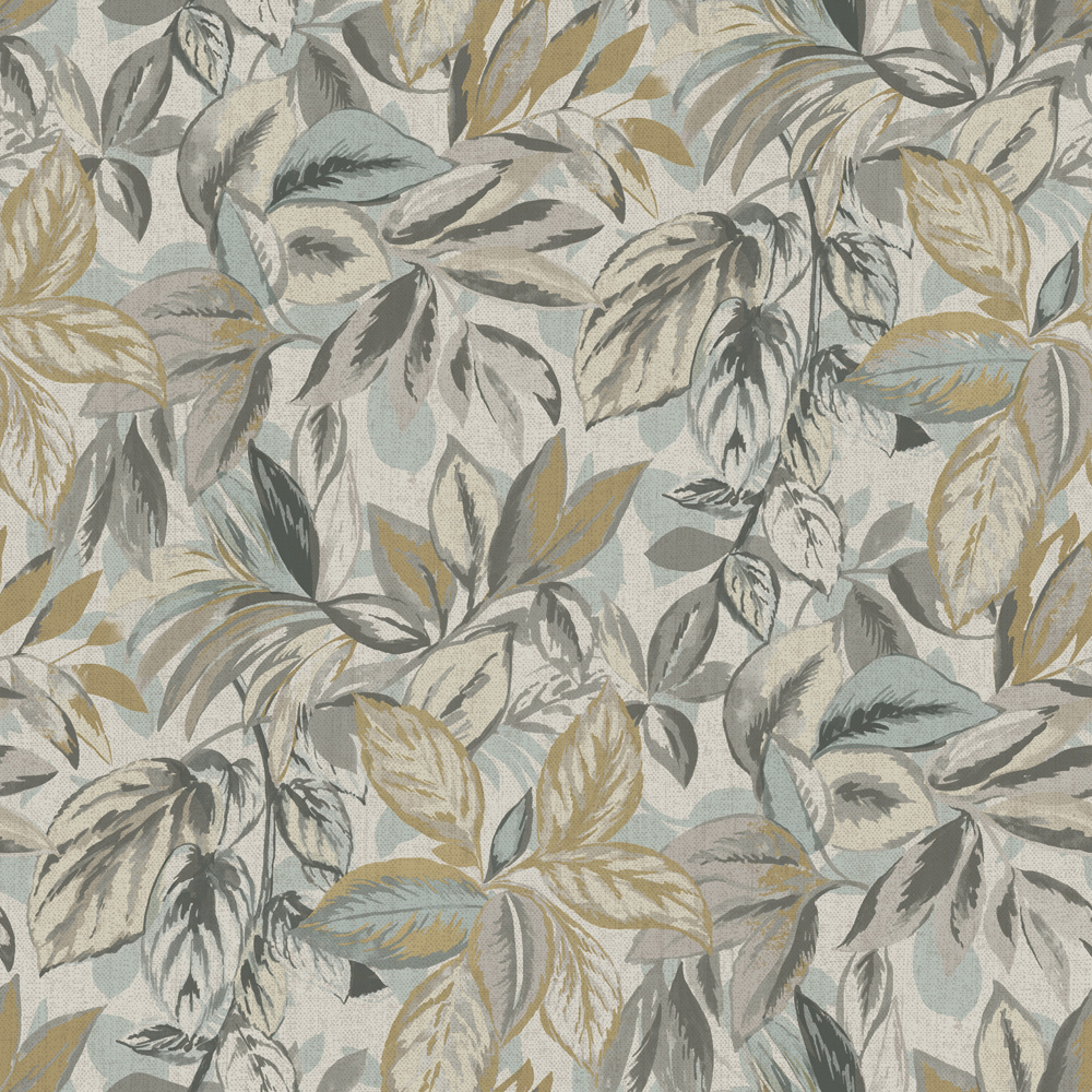Mönsterbeskrivning: Grå melerad tapet med bladverk i blåa och beiga toner.